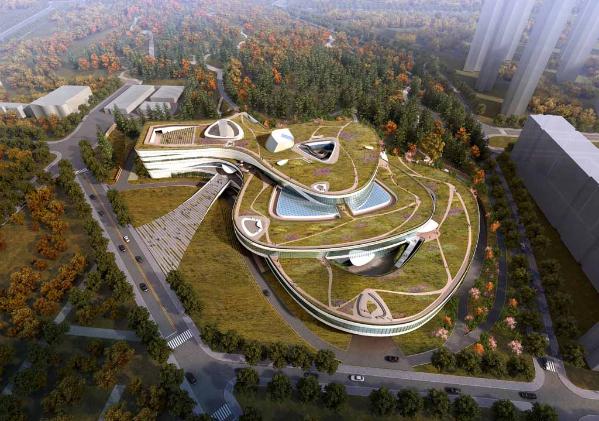 项目所在地为山地,建筑形体与山势相结合,形成3层退台式的空间布局。项目地上整体3层,局部2层,地下局部一层。地上建筑面积31625㎡,首层主要为学术报告厅及配套用房、科技体验区、特色文化区、自由学习区、网络数据中心。二层主要为学术报告厅及配套用房、校史展厅、深度研读区。三层主要为石油科教中心。北侧学术报告会议用房之下为地下一层,建筑面积1375㎡,主要为设备机房与车库。