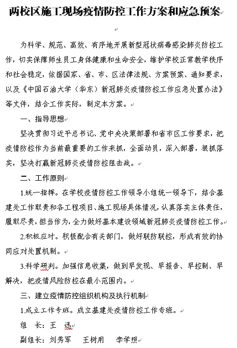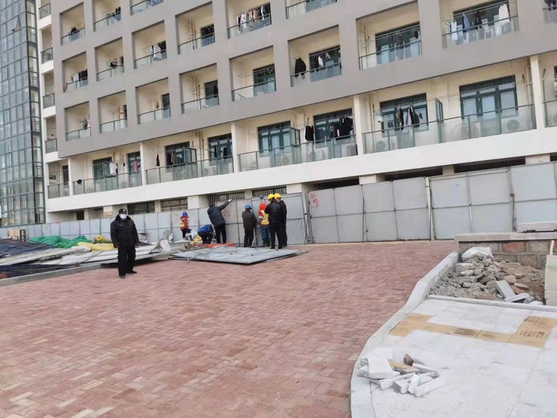 抓实各项疫情防疫工作。一是制定两校区施工现场疫情防控工作方案和应急预案,明确任务、压实责任。二是施工现场严格闭环管理,确保两校区施工现场与校园的物理隔离,杜绝与校内师生的交叉。三是加强入场施工人员管理,做好实名登记制度、“两码”查验、体温检测。四是加强施工现场防疫消杀,项目每天至少进行2次消杀工作,覆盖办公区、生活区、食堂、卫生间等区域。