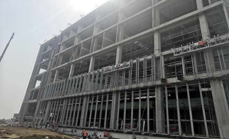 4 | 东侧 | 一层玻璃幕墙钢龙骨立柱安装完成;二到六层铝合金型材立柱整体完成20%,陶板钢龙骨完成80%。 | |