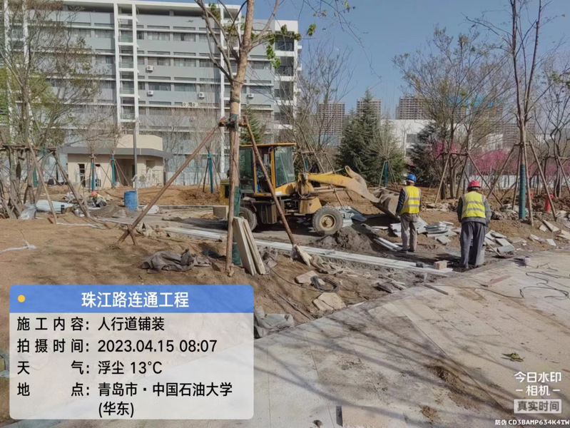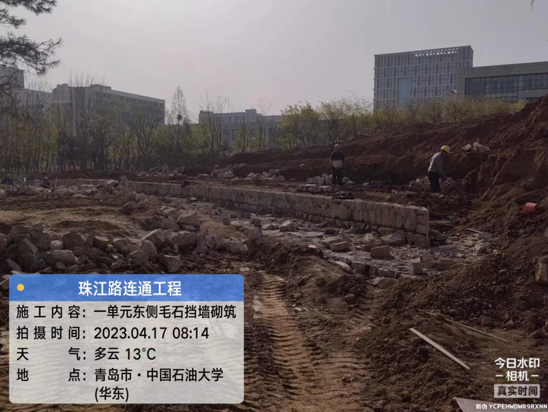 正在进行人行道砖铺装以及南侧毛石挡墙施工。