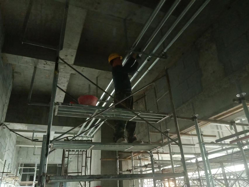 正在进行电气配管施工、屋面钢结构安装和室内精装钢架焊接等工作,预计7月底施工完成8月交工。