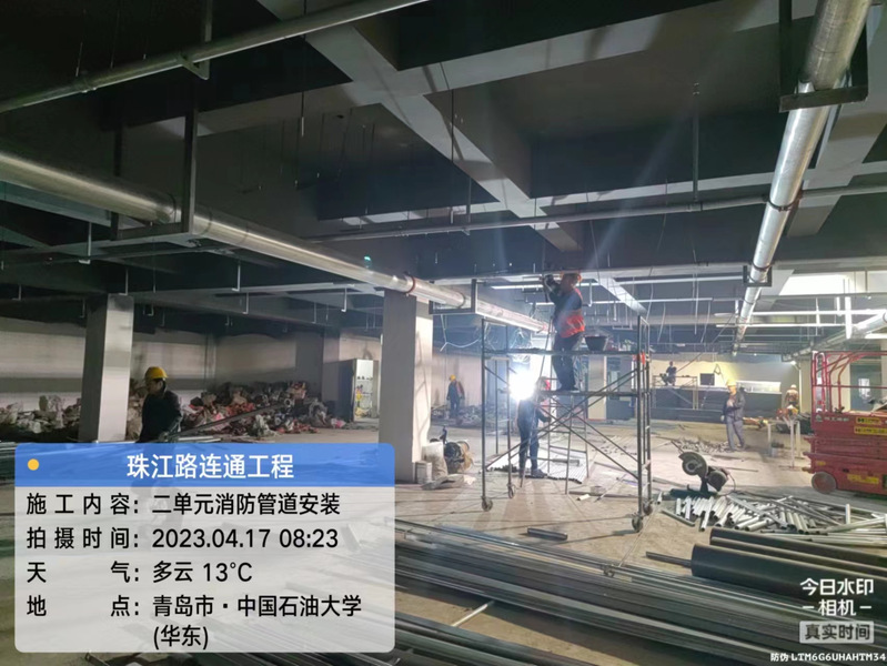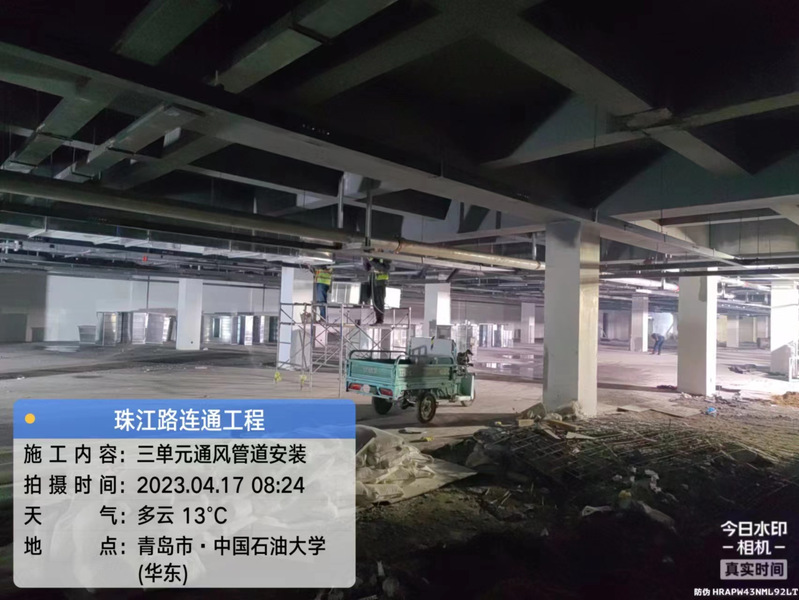 车库内正在进行强弱电桥架和通风管道安装工作,计划6月底完成工程施工,7月底竣工交付。