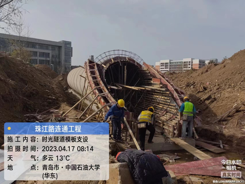 正在进行A出口南教楼北侧的地形整形、苗木栽植、时光隧道隧道安装、出入口砼浇筑。