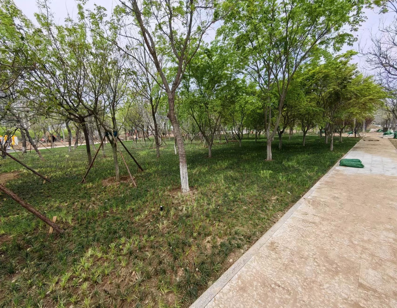 地被种植,初见形象。中心绿地计划5月底完成工程施工,拆除围挡。
